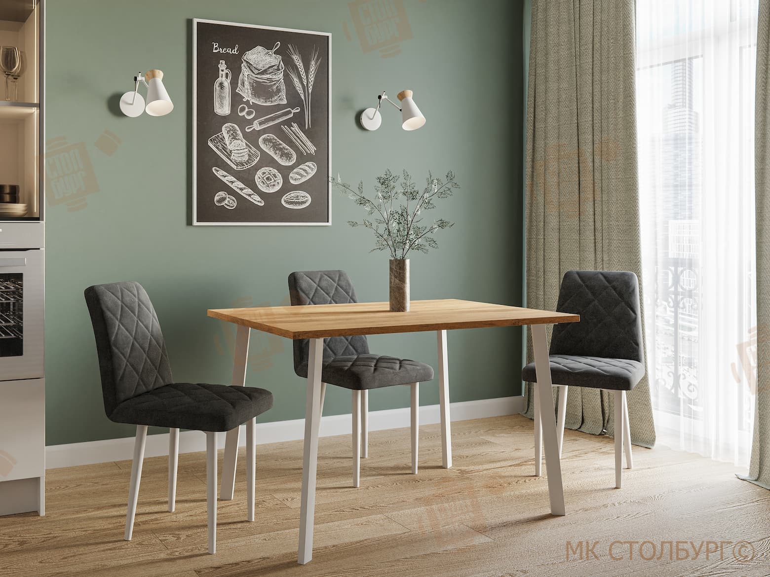 Лучше выбирать спокойные, неяркие тона столешницы. Светлые оттенки (светлое дерево, молочный, серый) меньше отвлекают и не утомляют глаза. Яркие акценты можно добавить с помощью аксессуаров.