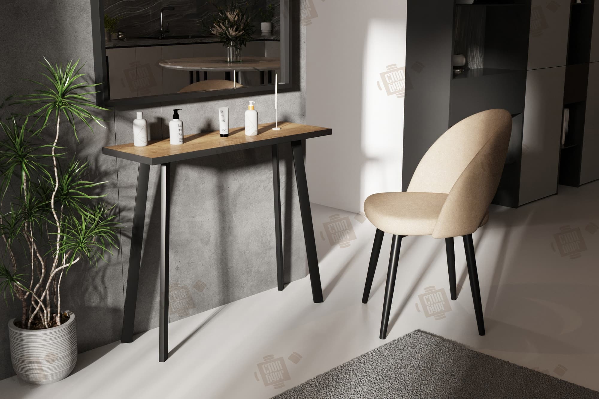 - Керамогранит — выбор для тех, кто ценит основательность. Такой столик не боится ничего: пролитые духи не оставят пятен, случайный удар флаконом не приведёт к сколу. Тяжёлая столешница придаёт конструкции дополнительную устойчивость.
