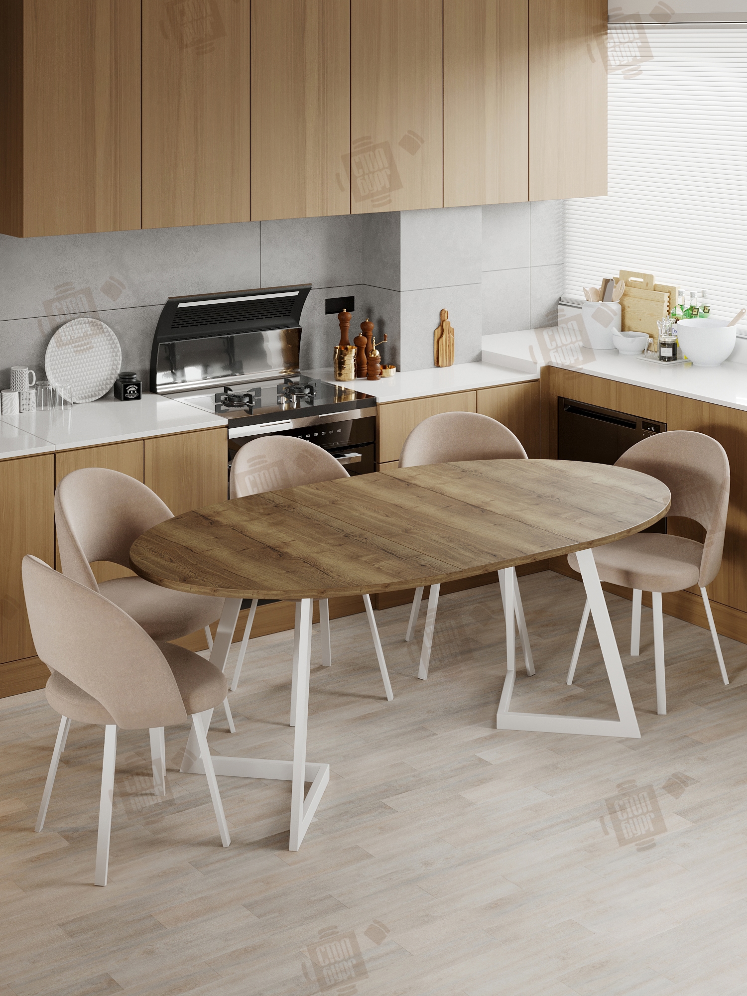 Овальная форма стола для гармонии на нестандартной кухне